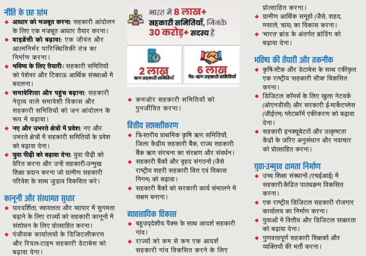 सहकारिता मंत्रालय के मुताबिक, देश में फिलहाल 8.50 लाख से सहकारी समितियां हैं, जिनमें 2 लाख ऋण सहकारी समितियां और 6 लाख गैर-ऋण सहकारी समितियां शामिल हैं जो आवास, डेयरी, मत्स्य पालन आदि क्षेत्रों में फैली हुई हैं। 30 करोड़ से ज़्यादा सदस्यों वाली ये समितियां, खासतौर पर ग्रामीण अर्थव्यवस्था को मजबूत आधार देती हैं। फिर भी इनका योगदान जीडीपी में अपेक्षाकृत कम है। नई नीति इसी अंतर को पाटने का रोडमैप सुझाती है। सहकारिता क्षेत्र के लक्ष्यों को हासिल करने के लिए छह मिशन स्तंभ और 16 उद्देश्य निर्धारित किए गए हैं।