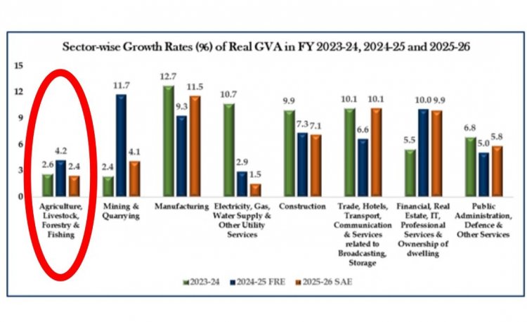 राष्ट्रीय सांख्यिकी कार्यालय (NSO) द्वारा आंकड़ों के अनुसार, वित्त वर्ष 2025-26 में कृषि, पशुपालन, वानिकी और मत्स्य क्षेत्र की वास्तविक वृद्धि दर केवल 2.4 प्रतिशत रही। यह कुल जीडीपी वृद्धि दर का लगभग एक-तिहाई है और विनिर्माण तथा सेवा क्षेत्र में दर्ज वृद्धि से काफी कम है।