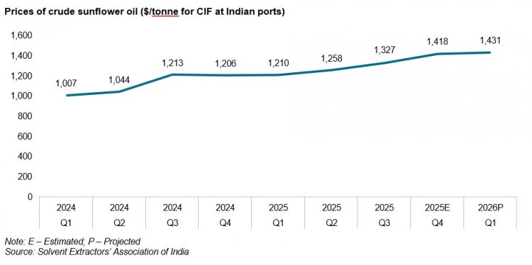 क्रिसिल रेटिंग्स की निदेशक जयश्री नंदकुमार ने कहा, “पश्चिम एशिया संघर्ष शुरू होने के बाद से कच्चे सूरजमुखी तेल का औसत आयात मूल्य बढ़कर वर्तमान में 1,420-1,440 डॉलर प्रति टन हो गया है, जबकि पिछले 12 महीनों में यह औसतन 1,275 डॉलर प्रति टन था। रुपये की कमजोरी और बढ़ी हुई शिपिंग लागत भारत में इसकी लैंडेड लागत को और बढ़ा रही है।”