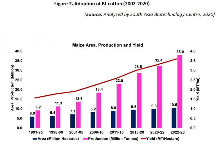 बीटी कपास के तहत खेती का क्षेत्र काफी बढ़ गया है। यह 70 लाख हेक्टेयर से 120 लाख हेक्टेयर तक पहुंच गया है। इसके परिणामस्वरूप कपास का उत्पादन लगभग दोगुना हुआ है। यह 2014 के 23 लाख टन से बढ़कर 40 लाख टन हो गया है। उल्लेखनीय रूप से कीटनाशकों का प्रयोग भी 40 प्रतिशत कम हुआ है, जिसका लाभ पर्यावरण और स्वास्थ्य में मिला। इस प्रक्रिया में लगभग 50 लाख कपास किसानों की आय तीन गुना बढ़ गई है। इसके अलावा, भारत से सालाना चार अरब डॉलर से अधिक का कपास निर्यात हो रहा है, जबकि बीटी कपास को अपनाने से पहले भारत आयातक देश था। एक अन्य उदाहरण सिंगल क्रॉस हाइब्रिड मक्का का है। पहला सिंगल क्रॉस मक्का हाइब्रिड 1995 में जारी किया गया था। सार्वजनिक और निजी दोनों क्षेत्रों द्वारा विकसित इस नए हाइब्रिड ने रकबा को 60 लाख हेक्टेयर एक करोड़ हेक्टेयर तक बढ़ाने में मदद की है। सिर्फ दो दशक में उत्पादकता भी एक टन से बढ़कर 3.5 टन प्रति हेक्टेयर और कुल उत्पादन एक करोड़ टन से बढ़ कर 3.8 करोड़ टन (2022-23) हो गया है (चित्र 3)।